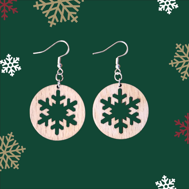 Apportez une touche hivernale et élégante à vos tenues avec ces boucles d’oreilles flocon en bois massif, où le motif est finement découpé dans un rond pour un rendu délicat et lumineux. Réalisées au laser dans du bois naturel et finies à la main, elles sont légères, raffinées et idéales comme cadeau de Noël.